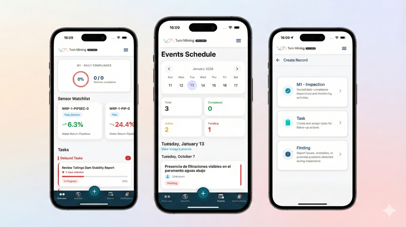 Twin Mining Tailings cuenta con una aplicación móvil para iOS y Android que replica las funcionalidades core del TMS, habilitando el registro en terreno de inspecciones diarias, hallazgos, observaciones y actividades operacionales. La app permite gestión de tareas, comunicación entre equipos y captura de evidencia directamente desde el campo, asegurando trazabilidad inmediata y alineación entre la operación en terreno y el modelo digital del depósito. Twin Mining Tailings provides a mobile app for iOS and Android that mirrors the TMS core functionalities, enabling field recording of daily inspections, findings, observations, and operational activities. The app supports task management, team communication, and evidence capture directly from the field—ensuring immediate traceability and alignment between on-site operations and the facility’s digital model.