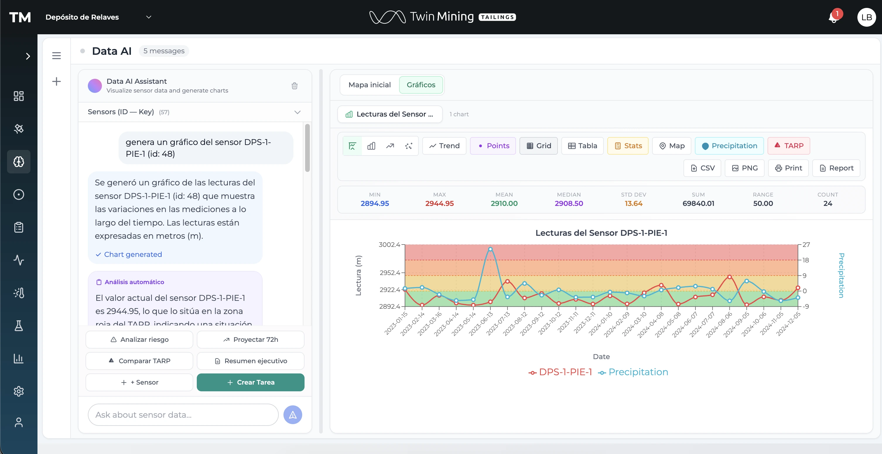 Twin Mining Tailings incorpora motores de Inteligencia Artificial y aprendizaje automático para analizar grandes volúmenes de datos técnicos y operacionales, identificar patrones no evidentes y anticipar comportamientos del depósito. La IA apoya la priorización de riesgos, la detección temprana de anomalías y la toma de decisiones técnicas, siempre integrada al Gemelo Digital y bajo validación experta. Twin Mining Tailings incorporates Artificial Intelligence engines and machine learning to analyze large volumes of technical and operational data, identify non-obvious patterns, and anticipate the facility’s behavior. AI supports risk prioritization, early anomaly detection, and technical decision-making, always integrated with the Digital Twin and validated by experts.