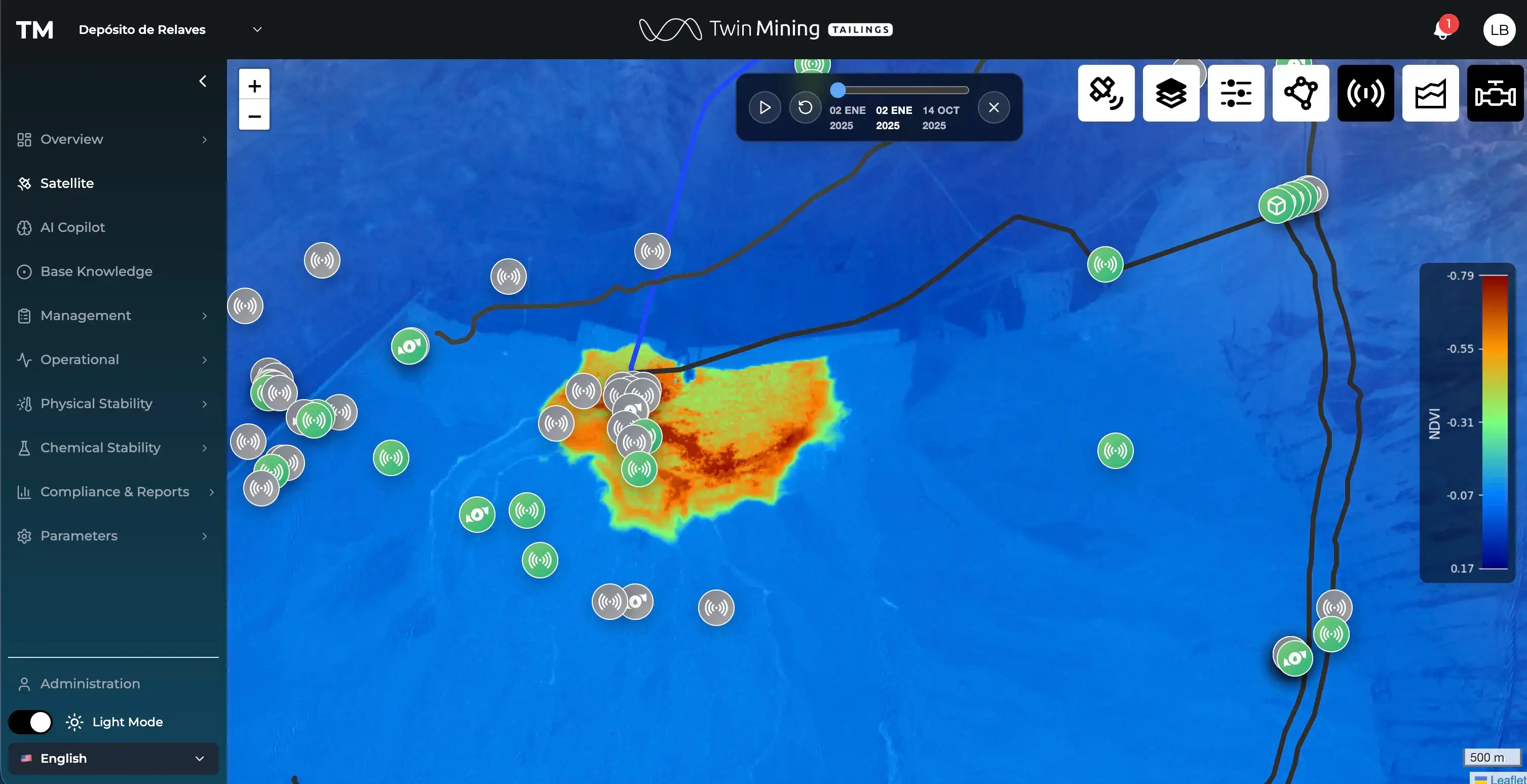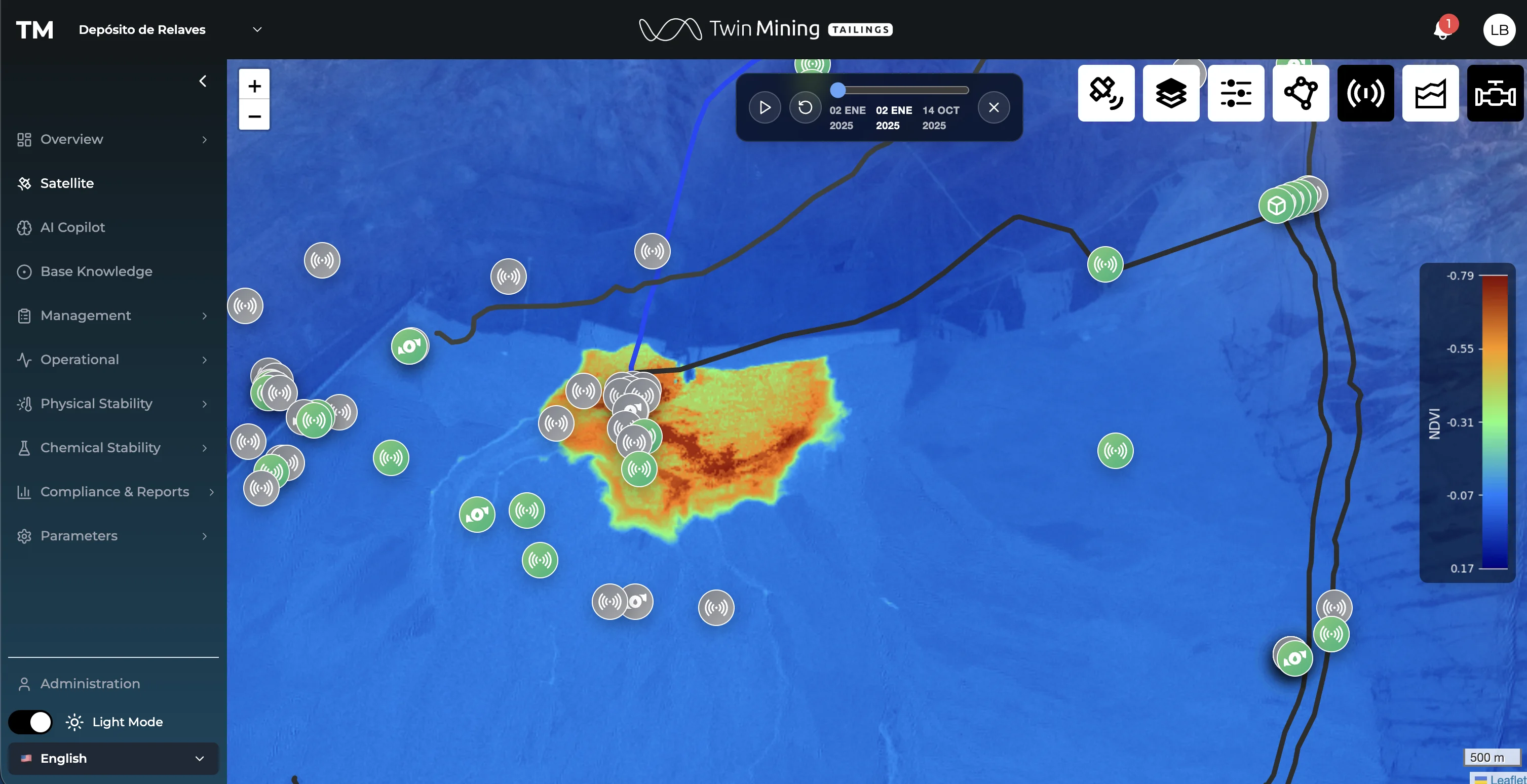 La plataforma consolida y correlaciona información proveniente de múltiples fuentes de monitoreo, instrumentación geotécnica y geoquímica, sensores IoT, monitoreo satelital (InSAR, óptico) y registros e indicadores operacionales, en un modelo único del depósito. Este enfoque elimina silos de información, mejora la confiabilidad de los datos y permite analizar tendencias y comportamientos complejos que no son evidentes al observar las variables de forma aislada. The platform consolidates and correlates information from multiple monitoring sources, geotechnical and geochemical instrumentation, IoT sensors, satellite monitoring (InSAR, optical), and operational records and indicators into a single facility model. This approach eliminates information silos, improves data reliability, and enables the analysis of complex trends and behaviors that are not apparent when observing variables in isolation.