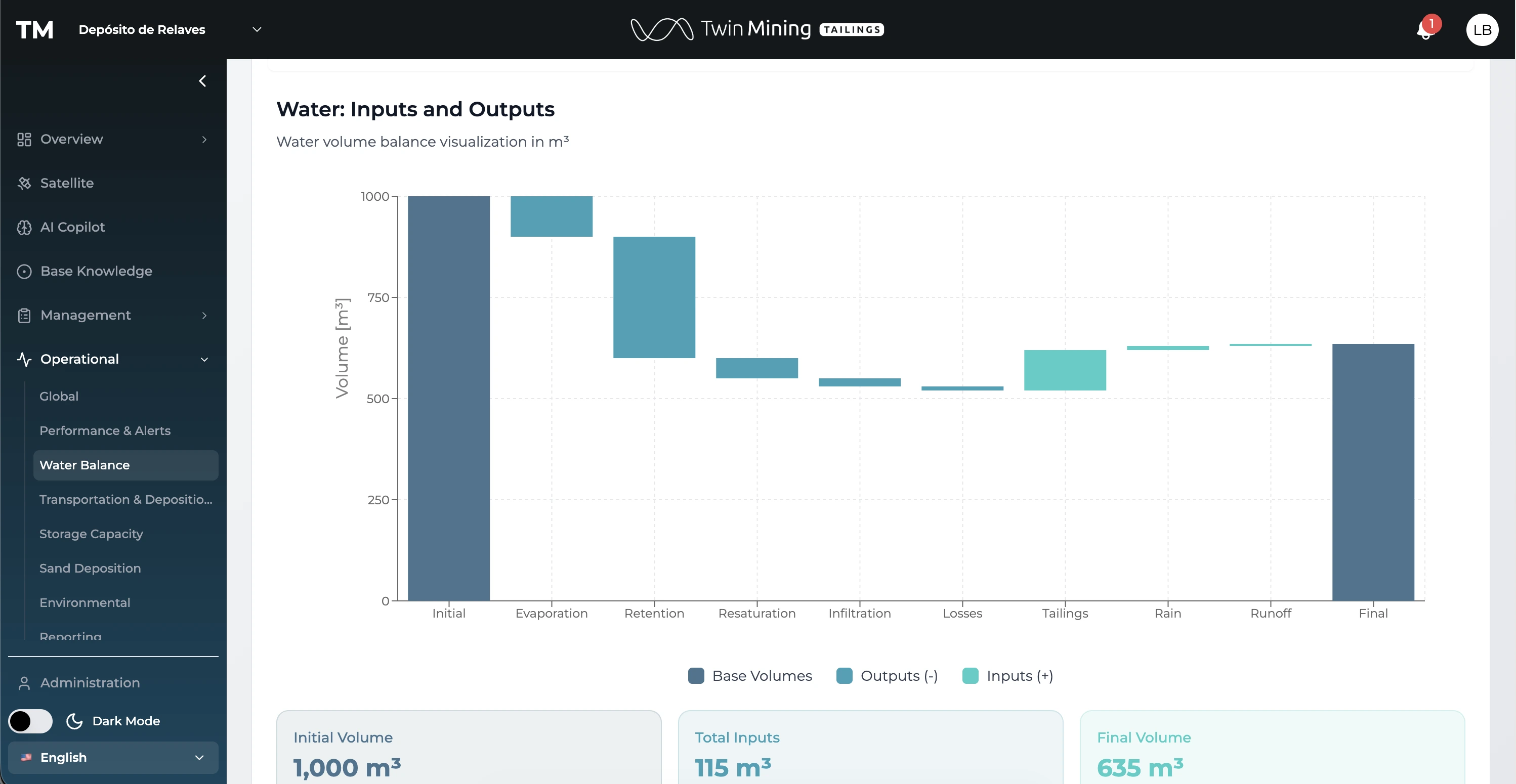 El TMS gestiona el balance aguas en tiempo real de planta y depósito de forma operativa y predictiva, integrando variables hidrológicas y operacionales dentro del gemelo digital para optimizar el uso del agua, reducir pérdidas y apoyar decisiones técnicas oportunas. The TMS manages the real-time water balance of the plant and facility in an operational and predictive way, integrating hydrological and operational variables within the digital twin to optimize water use, reduce losses, and support timely technical decisions.